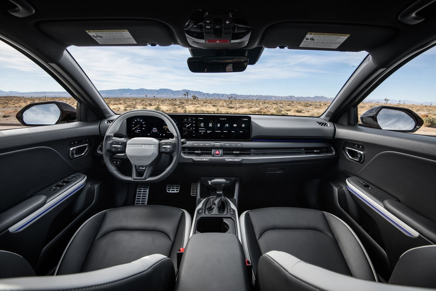 Inside, a dual digital display spanning nearly 30 inches integrates the instrument cluster and infotainment system. The available Connected Car Navigation Cockpit (ccNC) system provides navigation, AM/FM/MP3, HD Radio, and SiriusXM connectivity. Wireless Apple CarPlay and Android Auto come standard across all K4 Hatchback trims, eliminating cable clutter.